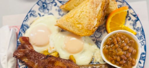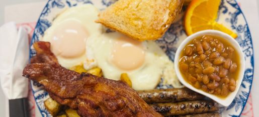 Two eggs, 3 bacon, 3 sausages, toast, beans, seasoned homefries